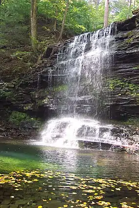 According to the United States Geological Survey Geographic Names Information System, Ricketts Glen State Park is at an elevation of 2,198 feet (670 m).[1] The two highest points in the park are Cherry Ridge, made of Mauch Chunk Formation rock, at 2,461 feet (750 m),[56] and the Grand View outcrop of Huntley Mountain Formation sandstone, at 2,444 feet (745 m).[55][84] The highest elevation waterfall in the park is Mohawk Falls in Ganoga Glen at 2,165 feet (660 m);[85] the lowest elevation waterfall is Adams Falls, in Ricketts Glen just south of PA 118, at 1,214 feet (370 m).[86]