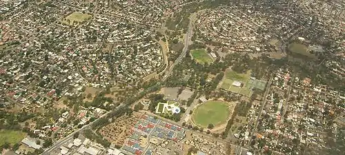 Aerial image of the northwestern part of Ridgehaven, looking northwest. Grenfell Road is the east–west road that is sloping downwards in the picture, and the north–south road that is visible is Golden Grove Road. Milne Road is indicated by the red arrow. Ridgehaven is the area to the west of Golden Grove Way and south of Milne Road, the half of the image in the bottom right. The blue and red roofed complex is the Masonic Village, and the green ovals to the north are part of Modbury Sports Reserve. Redwood Park is to the north of Milne Road, and Modbury Heights is to the left.