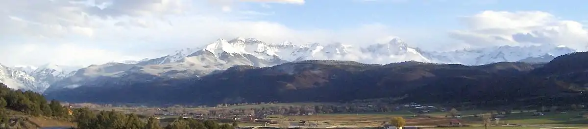 Ridgway is situated in the Uncompahgre Valley at an elevation of 6,985 feet (2,129 m). The town is located on the San Juan Skyway, cradled in the heart of some of the most photographed mountains in the world. The nearby San Juan Mountain Range has 14 of Colorado's 53 peaks over 14,000 feet.[10] Among them, 14,150 feet (4,310 m) Mt. Sneffels is most prominent from Ridgway. The eponymous Mt. Ridgway, 13,468 feet (4,105 m) in height, is also nearby, 4.5 miles (7.2 km) west of Ouray.[11] To the east of the town also lies the smaller but equally-grand Cimarron Range, with Uncompahgre Peak at 14,309 feet (4,361 m).