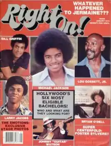 The magazine's title was derived from the expression of positivity and featured exclusive coverage of The Jackson 5.[2] Like Tiger Beat did with White American and Hispanic celebrities,[2] Right On! covered everything and everyone African-American and involved in the entertainment business. It also offered readers a close-up look into the lives of such celebrities as the Soul Train Gang, The Sylvers, Black Ivory and many more.