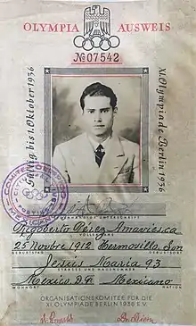 Rigoberto Pérez Identity Card for Berlin 1936 Olympic Games