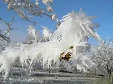 Soft rime is a white ice deposition that forms when the water droplets in light freezing fog or mist freeze to the outer surfaces of objects, with calm or light wind. The fog freezes usually to the windward side of tree branches, wires, or any other solid objects.