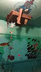 According to the owner, each table is named after a different composer and has a "pseudo elegant" decor.[1][14] Some of the tables are "haunted" (animated), at times rotating or vibrating; one rises 18 inches (46 cm) every 45 minutes, returning to its original position after moving through a succession of different heights.[4][8][14] The table named for Sergei Rachmaninoff shakes when a button in the kitchen is pressed, and the Stephen Sondheim table disappears completely through a slit in the wall.[14] Couches are also available for lounging.[6] The upstairs unisex bathroom has an "under-the-sea" theme and reportedly "regularly induces screams".[8][14]
