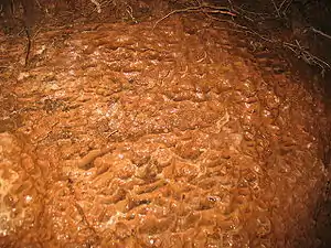Rimstone or gours can be formed by the secondary deposits derived from concrete, lime or mortar. These secondary deposits consisting primarily of calcium carbonate, are called calthemites and mimics the shapes and forms of cave speleothems to create stalactites, stalagmites, flowstone and gours.[2] Gours form beneath concrete structures on a floor with a gradual sloping surface or on the side of rounded stalagmites derived from concrete. Most of the calcium carbonate carried by the leachate is deposited as stalactites (when the drop rate is slower than one drop per minute),[2] leaving little in solution to be carried to the ground to create stalagmites, flowstone and gours. The leachate which does reach the ground usually evaporates quickly due to air movement beneath the concrete structure, hence micro-gours are more common.