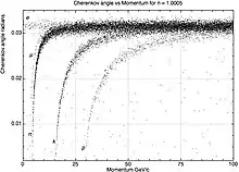 Knowledge of the particle's momentum and direction (normally available from an associated momentum-spectrometer) allows a predicted for each hypothesis of the particles type; using the known of the RICH radiator gives a corresponding prediction of that can be compared to the of the detected Cherenkov photons, thus indicating the particle's identity (usually as a probability per particle type). A typical (simulated) distribution of vs momentum of the source particle, for single Cherenkov photons, produced in a gaseous radiator (n~1.0005, angular resolution~0.6mrad) is shown in the following figure: