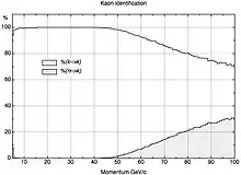 In practice, for the multi-particle final states produced in a typical collider experiment, separation of kaons from other final state hadrons, mainly pions, is the most important purpose of the RICH. In that context the two most vital RICH functions, which maximise signal and minimise combinatorial backgrounds, are its ability to correctly identify a kaon as a kaon and its ability not to misidentify a pion as a kaon. The related probabilities, which are the usual measures of signal detection and background rejection in real data, are plotted below to show their variation with momentum (simulation with 10% random background);