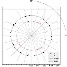 A polar plot of the Cherenkov angles of photons associated with a 22 GeV/c particle in a radiator with =1.0005 is shown below; both pion and kaon are illustrated; protons are below Cherenkov threshold, , producing no radiation in this case (which would also be a very clear signal of particle type = proton, since fluctuations in the number of photons follow Poisson statistics about the expected mean, so that the probability of e.g. a 22 GeV/c kaon producing zero photons when ~12 were expected is very small; e−12 or 1 in 162755) The number of detected photons shown for each particle type is, for illustration purposes, the average for that type in a RICH having ~ 25 (see below). The distribution in azimuth is random between 0 and 360 degrees; the distribution in is spread with RMS angular resolution ~ 0.6 milliradians.