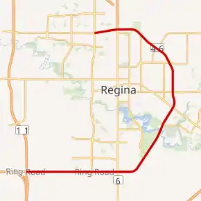 Ring Road is a 4 lane controlled access highway in Regina, Saskatchewan, Canada. Ring Road is a partial ring road or beltway that forms a partial circle around Regina, bypasses the city on the north, east, and south sides, with Lewvan Drive and Pasqua Street N functioning as the de facto western leg. East of Pasqua Street, Ring Road continues west as 9th Avenue N, an arterial road. Ring Road has a speed limit of 100 km/h (60 mph) and consists of 13 interchanges.