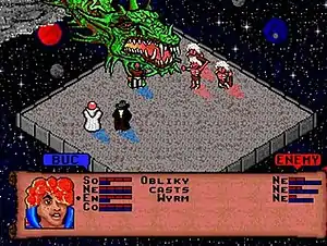 Combat can either be initiated with a command while talking to a pedestrian or may occur randomly while traveling. During combat, Buc and his party are located on the left side of the screen and have blue shadows, while their opponents are located on the right side and have orange shadows. Each party member is equipped with a strength and magic meter, which are affected by how much damage a character takes or the type of spells the character uses. A party member will die if their strength meter is fully depleted, and a character will only be able to cast weak spells if their magic is depleted. The player can set the party's spells to be selected automatically or manually, and can adjust how aggressively a party member behaves in a fight.[5] Winning a fight grants the party currency and experience points,[1] which can be used to learn stronger spells.[6] Strength and magic can be restored by camping, which also accelerates the passage of time.[7]