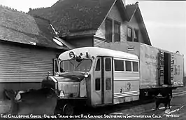 The RGS had the displeasure of experiencing yet another economic downfall, the Great Depression. This was a massive hit on the RGS and affected it to the point where they couldn't afford to operate one single steam locomotive (Paying for Fuel, Paying the Engineer and Fireman to operate the locomotive, etc.). However, they still had the responsibility to ship US Mail. That could have been the end of the line for the RGS, but Chief Mechanic Jack Odenbaugh thought otherwise. In 1931 he devised a way to construct seven homemade "railcars" that would be cheap to build and operate, capable of transporting US mail and a few passengers. The official names given from the RGS were "Motors", but these railcars would later be unofficially named "Galloping Geese" by Railfans because of how they looked, operated, and sounded.- Waddling down the poorly maintained, unlevel RGS tracks with a silver-painted body and hood covers that looked like goose wings when opened up to prevent the motor from over-heating, and the horn sounding somewhat like a honking goose. These railcars are arguably one of the most iconic aspects of the RGS and are known by most narrow-gauge railfans. The first Goose (RGS Motor #1) was built from a recycled Buick body, frame, and engine, and #2 and would be as well, but with a larger and enclosed freight compartment, a requirement to haul US mail. Motors #3 through #5 and #7 were built from Pierce Arrow bodies, but with freight compartments the size of a boxcar. Motor #6 was made from a Buick as well, but it was designated for Maintenance of Way service, and only had a flatbed attached behind the cab. Later on, Motors #3 through #5 would receive replacement Wayne Buss bodies. These motor cars indeed were successful and handled daily services until 1940 when the RGS could afford to run regular freight trains. Even after that, the Geese completely replaced revenue-generating passenger trains until abandonment; almost all passenger coaches the RGS owned at the time had been put into MOW service since.[4][5]