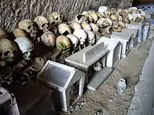 One of most peculiar traits of Rione della Sanità is a unique cult and ritual that takes place in the ossuary of the Fontanelle cemetery. The cult dates back to the 17th Century and involves the ritual burning of candles dedicated to the so-called "pezzentelle" ("little wretches"), i.e., the soul of the "nameless dead" whose bones are preserved in the ossuary. More specifically, Neapolitan families traditionally "choose" one specific skull from the ossuary and take care of it (cleaning it up, repositioning it properly in the ossuary, and so on), with the intent that the "adopted" nameless soul will repay those attentions with good luck and blessings. While the cult has a general Christian-Catholic frame (as the "pezzentelle" are usually identified as Purgatory souls), many of its elements are rather pagan in nature, so that it can be classified as a syncretic cult.[2]