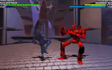 In two player versus mode, one player controls the ECO35-2 droid by default, while the other chooses between one of the five droids seen in single player mode (a special cheat code can enable the Supervisor as well). Players then battle out against each other in two to seven rounds. In the arcade version, the players select eighteen characters but each six characters has a different colour palette.