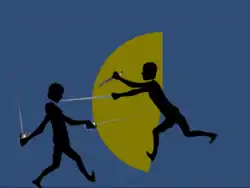 In Rivalry, two players take turns at moving their ragdoll character’s limbs and weapons until one is victorious. While the beginning stages of each game captures the strategic essence of swordplay,[11] as damage and limbs are taken, the endgame turns rather Pythonesque.