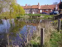 The river now curves northwest through the village towards Thorpe common. The Manor House on Thorpe common has a moat all around supplied with water from the river. Further on the river passes under the route of the dismantled West Norfolk Junction Railway to the east of Burnham Market. From here the river widens a little and flows into the mill pond at Burnham Overy.