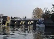 Close to its start, Ember Mill stood on an island in the Ember reached from a footbridge at the end of Orchard Lane by Imber Court, Thames Ditton. The mill was demolished around 1837 and the sluices and waterfalls on either side are all that remain to indicate the site.[2] The mill was originally a corn mill but was later used for manufacturing brass and iron wire.[3] This part of the Ember is bypassed by the new channel of the flood prevention scheme, but a small flow runs into the old course to keep it looking largely as it used to.[4]