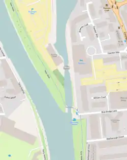 The River Foss Barrier is a floodgate that straddles the River Foss in York, England at the confluence of the Rivers Ouse and Foss just south of Clifford's Tower. The barrier was opened in 1988 after flooding from the Foss and two other becks caused more damage to properties in the city than when the Ouse was in spate. The purpose of the barrier is to prevent backing up of floodwater from the Foss when it meets the surgewater of the Ouse and cannot drain away.[1] The pumps adjacent to the barrier move water from the Foss into the Ouse.[2]