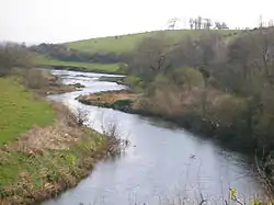 A mile and a quarter (2 km) below Galston it receives from the north the Polbaith burn; ¾ of a mile (1.2 km) lower down, the Cessnock water joins it from the south; and 3 miles (4.8 km) later it passes Kilmarnock and Riccarton on opposite sides, and receives on its right bank the tributary of the Kilmarnock (or Marnock) Water. Four miles (6.4 km) or more along its bed, Carmel Water joins it on the right bank; and 2½ miles (4 km) farther on, it receives the Annick Water, again on the right bank. The river now runs 1½ mile (2.4 km) in a north-west direction, passing through the town of Irvine; it then suddenly bends round until it follows a southerly direction; and opposite the town of Irvine, when running southward, it suddenly expands into a basin ¾ of a mile (1.2 km) wide. It receives the Garnock river at its north-west extremity, and communicates by a narrow mouth or strait with the Firth (previously Frith)[7] of Clyde. The course of the Irvine is recorded as having shifted in an old Eglinton Estates document, a map recording the previous course with a note that the water left the old riverbed in 1758. This altered the confluence of the River Irvine with the Annick Water.[8]