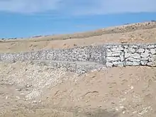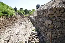 Windrows are the piling of erosion-resistant material on a river's bank, where if buried, they become known as trenches. When erosion persists an already determined location, these windrows and trenches are made to slide down with the bank in order to protect it from further occurrences of erosion.[13] This allows for the need of minimal design work, in that installation is simple on high banks, although other methods could lead to failure.[12] Disadvantages include the windows and trenches continuing to erode until they intersect the erosion-resistant material. Results of this method have been seen to be inconsistent, as the steep slope of the bank leads to increased velocity of the river.[12]