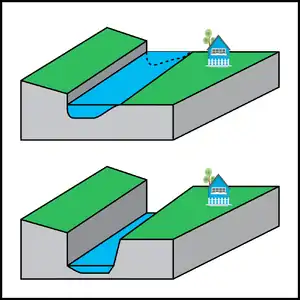 Traditional logging in the West coast of the United States included many practices which increased river incision. Timber removal and the associated road construction facilitate runoff and thus increased erosion and sediment delivery to streams.[3] Increases in sediment increases the water's stream power, increasing the stream's ability to do geomorphic work on the bed and banks.[4] This leads to scouring of the bed material, exposing the bedrock channel bed to erosion and thus faster rates of channel incision.[5] The scoured bed material consists of finer sediments such as silts, sands, and gravels. The removal of these removes important aquatic habitats for salmonid species and other aquatic organisms.[6] In many agricultural areas, rivers have been straightened and dyked for flood control and to plant crops in the floodplain.[7] Normally, floods are allowed to spread out across the floodplain, allowing deposition of sediment and slowing water speeds, reducing the erosive potential of the water.[8] Channelization concentrates flood flows down the active channel, increasing erosion. River incision due to agriculture is well-documented throughout the agricultural regions of the world, such as the Central Valley of California.[9]
