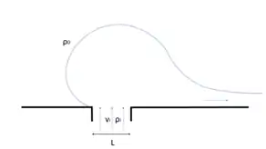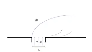 In the near-field the momentum of the plume is larger than its buoyancy. This balance is represented in the (dimensionless) Froude number, and is larger than one in the near-field, indicating supercritical flow. Both the liftoff point and the outer boundary of the near-field, the plume front, are characterized by critical flow conditions () and the flow in the near-field region shows features similar to a jet.[8] The momentum balance is dominated by barotropic and baroclinic pressure gradients, turbulent shear stresses and flow acceleration. Flow deceleration is mainly caused by the shear stresses on the interface of the plume with the ambient ocean. In some cases a near-field region will not exist. This is for example the case if the width of the river mouth is large relative to the Rossby radius of deformation, , and the fresh water inflow will leave the river mouth as a far-field plume. When tides are large the near-field plume is also known as the tidal plume.[9]