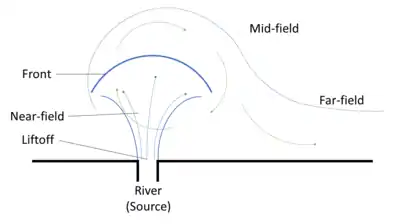 The balance between the important processes varies over the position in the plume. The following regions can be distinguished: the source region, the liftoff point, the front and the near field region. Beyond the plume itself but within its area of influence are the mid-field region and the far field region.[1]