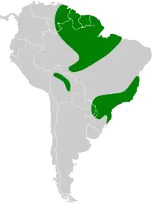 It is found at low levels near water in forests and woodlands. Its range includes three disjunct populations, with one (M. r. mesoleuca) in the eastern Amazon of Brazil, the Guianas, and southern and eastern Venezuela, the second (nominate subspecies) in the Atlantic Forest of south-eastern Brazil, eastern Paraguay and far north-eastern Argentina, and the final population (M. r. bolivianus) in the Yungas of Bolivia.