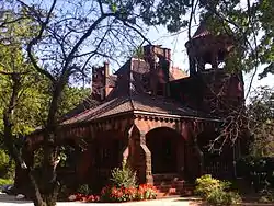 The architectural style of the building has been variously described as "French château",[9][10] Gothic Revival,[8] and Romanesque Revival.[5][6] One source called it a combination of Gothic Revival and Romanesque Revival.[11] The structure consists of a steel beam frame[11] with red-colored brownstone walls. The stone was quarried near Longmeadow, Massachusetts,[10][11][12] and mortared with Portland cement.[9][11] The base of the veranda which wraps around the building is poured-in-place cement.[11] The building features a turret on the southwest corner that reaches beyond the roof, dormer windows on the second floor, and buttresses on all sides.[8]