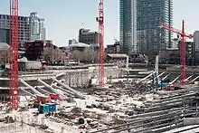 Canary Wharf Contractors Limited were contracted to construct the basement structure up to ground level. Work on the basement slab for Tower 1 began in July 2009, with concrete being poured for the basements. Two crane bases appeared on site in September 2009, but work ceased in 2010. In December 2010, JP Morgan said that it would be moving its London staff into 25 Bank Street, a smaller building on the Canary Wharf estate that was once the London office of the collapsed investment bank Lehman Brothers. In April 2011, JP Morgan announced their intention to complete the building up to street level with work due to start in October 2011.[6] As of April 2014, work on the basement levels is complete but it is unclear if JP Morgan intend to commence with full construction.