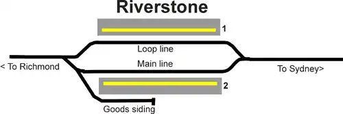 Riverstone station was located on the eastern side of the line with a track layout which included a short platform loop, and a siding for general goods and to serve the local sawmill. In addition to the brick platform, the station included a brick built combined waiting room, station office and living quarters constructed in 1864. In 1879 a siding known as Richards Siding was built to service the abattoirs.[2]