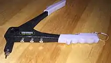 Prior to the invention of blind rivets, installation of a rivet typically required access to both sides of the assembly: a rivet hammer on one side and a bucking bar on the other side. In 1916, Royal Navy reservist and engineer Hamilton Neil Wylie filed a patent for an "improved means of closing tubular rivets" (granted May 1917).[4] In 1922 Wylie joined the British aircraft manufacturer Armstrong-Whitworth Ltd to advise on metal construction techniques; here he continued to develop his rivet design with a further 1927 patent[5] that incorporated the pull-through mandrel, and allowed the rivet to be used blind. By 1928, the George Tucker Eyelet company, of Birmingham, England,[6] produced a "cup" rivet based on the design. It required a separate GKN mandrel and the rivet body to be hand assembled prior to use for the building of the Siskin III aircraft. Together with Armstrong-Whitworth, the Geo. Tucker Co. further modified the rivet design to produce a one-piece unit incorporating mandrel and rivet.[7] This product was later developed in aluminium and trademarked as the "POP" rivet. The United Shoe Machinery Co. produced the design in the U.S. as inventors such as Carl Cherry and Lou Huck experimented with other techniques for expanding solid rivets.