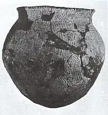 53 vessels of Wayne Ware were recovered. Wayne Ware is characterized by globular to slightly elongated vessels with constricted neck and outflared rims; grit-tempered with fine to medium grains; rims are plain and rarely decorated; and almost never castellated or collared. Surface finish is generally cordmarked. This type is similar to the “generalized woodland” or generic grit-tempered cordmarked vessels typical of the transition from Middle Woodland to Late Woodland.[1][6]