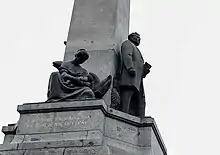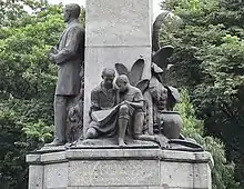 There is also no official explanation of the meaning of the monument's details. The monument depicts Rizal in an overcoat holding a book, that has the title "NOLI ME TÁNGERE" inscribed. This is contrary to the usual representation of the book as a symbol of both the inscribed novel and its sequel El Filibusterismo, as well as Rizal's annotation of Antonio de Morga's Sucesos de las Islas Filipinas.[4] The obelisk is usually taken to mean Rizal's masonic background while the three stars are said to stand for Luzon, the Visayas and Mindanao. The figures at the back of the monument, such as leaves and a pot, are said to symbolize the country's natural resources. The consensus is that the figures beside Rizal—a mother rearing her child and two young boys reading—signify family and education.[5]
