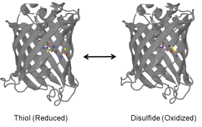 In 2004, researchers in S. James Remington's lab at the University of Oregon constructed the first roGFPs by introducing two cysteines into the beta barrel structure of GFP. The resulting engineered protein could exist in two different oxidation states (reduced dithiol or oxidized disulfide), each with different fluorescent properties.[2]