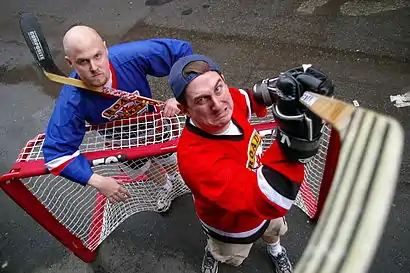 Road Hockey Rumble is a half-hour reality series produced by Paperny Entertainment and broadcast on OLN. The series uses a documentary format but crosses over into the genres of sports, travel, and comedy. It follows two Canadian hosts, Calum MacLeod and Mark McGuckin playing their way across Canada in a 13-game grudge match series of Road Hockey. From British Columbia to Newfoundland and all of the territories, they tap into the rivalries, legends and grit of Canada’s most colourful and competitive towns. Friends in life but rivals in hockey, each host drafts their own team of locals to battle it out on the court.