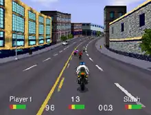 The racer begins the game with a set amount of money and earns cash prizes for each successful race.[9][11] From the main menu, the player can access a shop and view several bikes of differing weights, speeds and steering capabilities, and the player may purchase a new bike with the money they have accumulated. As the bikes become faster as each level progresses, purchasing a faster bike eventually becomes essential for keeping up with the other racers.[11][12] Some bikes are equipped with a series of nitrous oxide charges, which can provide a burst of speed if the player quickly taps the acceleration input button twice.[5][8] The player will advance to the next level after winning a race on all five of the game's tracks.[9][13] With each subsequent level, the bikes become faster, the other riders fight more aggressively and the tracks become longer and more dangerous.[1][14] The player wins the game by winning a race on each track in all five levels.[2][3][13]
