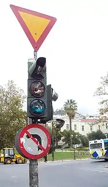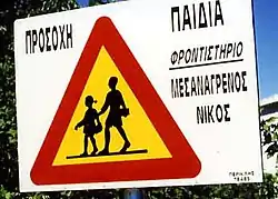 The first road signage on Greek roads with contemporary signs was made in 1924 by ELPA (Elliniki Leschi Periigiseon kai Aftokinitou, lit. translated: Hellenic Club of Tours and Car),[3] which took over the road network's signage until 1957, when it was taken over by the state.[4] The signs were subject to the provisions of the Geneva Protocol on Road Signs and Signals.