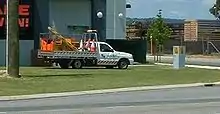 Typically, a worksite will be set up with warning signage well in advance of the actual work area. This may involve (in Australia) "Roadworks Ahead", temporary speed restrictions, "Worker Symbolic" (a stylized workman with a pile of rubble, black silhouette on a retroflective orange background), "Reduce Speed", "Lane Status" boards (indicating that some lanes on a multilane roadway will be closed), "Prepare to Stop" and advisory signs telling what is happening (e.g. Water Over Road, Trucks Entering, and Power Line Works Ahead). If lanes have been closed, large flashing arrows (Arrow Boards) on trailers may be utilized to give motorists hundreds of meters warning to move over. Motorists will be advised they are leaving a worksite by speed reinstatement or "End Roadworks" signs.