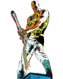 Roadblock grew up with a large extended family, but was shy despite being a Boy Scout and singing in the church choir.[1] Before he enlisted in the U.S. Army, Roadblock wanted to be a gourmet chef, and was working as a bouncer to earn enough money to attend Escoffier School in France. An army recruiter convinced him that he could learn to be a chef in the Army. After enlisting, Roadblock found Army food appalling, and transferred to infantry where he excelled at using heavy weapons. Roadblock is one of the biggest and strongest members of G.I. Joe, able to carry a fully loaded M2 Browning machine gun as a personal weapon, which can weigh up to 134 lbs, which usually requires a dedicated squad to transport and operate. Despite working in infantry, he still maintains his passion for making good food, and indulges in it while engaging in his secondary duty. He is a qualified expert with the M2 Browning .50 cal heavy machine gun, all Warsaw Pact heavy machine guns, M-16, and the M-1911A1 auto pistol.[2]
