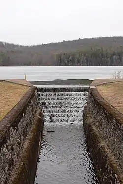The headwaters of Roaring Brook are in a 30-acre lake known as Harris Pond.[2][9] It is dammed by the Harris Pond Dam, which is made from earth, concrete, and masonry. It is approximately 10 feet (3.0 m) high and 135 feet (41 m) long (including the spillway). As of 1981, the dam is in relatively good condition.[1]