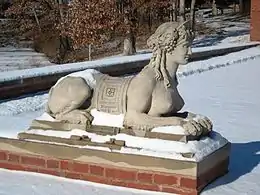When the original bridge over the Sangamon River was built in 1915 a levee was constructed across the floodplain north of the river to form a level approach to the bridge. The entrance drive including the levee was paved with a single lane brick farm-to-market road running east from the Gate House, south to Allerton Road (Route 6; C.R. 1450N) and on into Monticello to accommodate fully loaded wagons going into town. An unpaved lane ran alongside the brick for the return trip. Both lanes were paved with asphalt in 1981.[37] Two brick columns topped with statues of the goddess Diana and her companion, an Ephebe, were placed at the southeast gate on Allerton Road. When the old bridge was replaced by a new bridge in 2012 the entrance drive through the park was designated Old Levee Road.[38]