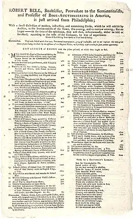 Bell arrived in Philadelphia from Dublin in 1767.[7][lower-alpha 1] In 1769, or early in 1770, Bell established a printing press and shop in Philadelphia in a building which previously housed the Union Library, located next door to Saint Paul's Church, on Third street. He soon became known as an auctioneer of books, once referring to himself on record, 7 February 1774, as a "Professor of Book Auctioneering."[3] Unlike many other printers, Bell did not own or work for any newspaper, had no government contracts and had to rely on his own prospects.[9]