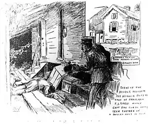 ![]() Sketch of the scene at Robert Charles' residence on the 2000 block of Fourth Street. Body in the middle is Patrolman Lamb; the body is the left background is that of Captain Day | ||||