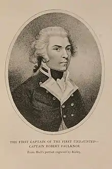 Robert completed his term at the Academy in March 1777 and joined HMS Isis (50 guns), under the Hon. William Cornwallis, stationed in North America. He then followed Cornwallis to HMS Bristol (50 guns) and then HMS Lion (64 guns), seeing many engagements in 1779/80. From December 1780 to March 1783 Robert served in HMS Princess Royal (98 guns) and HMS Britannia (98 guns), leading Rear-Admiral Sir Joshua Rowley to call him "a young man of great merit."[2] After the American War of Independence, Robert Faulknor was one of a lucky few officers to gain peacetime commissions and was put in command of the sloop HMS Merlin after Britannia's paying-off in March 1783 and then, from December 1783, to HMS Daphne (20 guns).