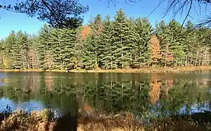 The middle section of the Robert Frost Trail traverses the Connecticut River Valley in the vicinity of eastern Amherst, south Leverett, and abutting towns. Highlights along the way include the 1,000-acre (4.0 km2) Lawrence Swamp, Pomroy Pond, Harkness Brook Ravine, Amethyst Brook, the Mount Orient ledges, Atkins Reservoir, Cushman Brook Ravine, Puffer's Pond, and the Leverett Knobs. The ledges of Mount Orient and the swimming beach at Puffer's Pond are popular locally. Harkness Brook, Amethyst Brook, and Cushman brook offer shaded brookside walking and cascades. Lawrence Swamp is a major local wildlife habitat and aquifer.[1][5]