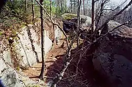 The southernmost section of the Robert Frost Trail weaves over and around the trap rock Holyoke Range several times. It follows the southern slopes of the range from Mount Holyoke to Mount Hitchcock, ascends Bare Mountain, then crosses to the north slope of the range before summiting Rattlesnake Knob (the eastern peak of Mount Norwottuck), and Long Mountain. Microclimate ecosystems, rare plant habitats, vernal pools, caves, and abrupt cliffs are the fare.[1][3] Also located on this trail section are the Horse Caves, an overhang of sedimentary rock said to have been used as a bivouac by rebels during Shays' Rebellion.[4]