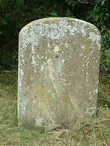 In September 1955 Patience and Gibbings bought Footbridge Cottage, a tiny beehive of a cottage in Gibbings's words, in Long Wittenham on the banks of the Thames. Life there suited Gibbings, and he had a period of tranquility that he had not known previously. They lived there until Gibbings died of cancer in hospital at Oxford on 19 January 1958.[1] He is buried in the churchyard at Long Wittenham. The grave is marked by a simple headstone featuring his device of a crossed quill and graver, carved by Michael Black, a young sculptor who was a friend of Gibbings.[15]