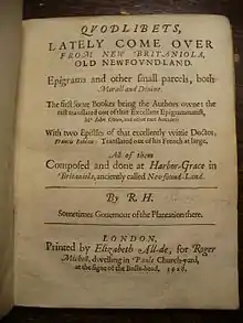 - 'Qvodlibets, lately come over from New Britaniola, old New-found-land. Epigrams and other small parcels, both morall and diuine. The first foure bookes being the authors owne: the rest translated out of that excellent epigrammatist, Mr. Iohn Owen, and other rare authors: With two epistles of that excellently wittie doctor, Francis Rablais: translated out of his French at large. All of them composed and done at Harbor-Grace in Britaniola, anciently called Newfound-Land.' (1628)