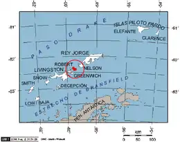 Robert Island or Mitchells Island or Polotsk Island or Roberts Island is an island 11 miles (18 km) long and 8 miles (13 km) wide, situated between Nelson Island and Greenwich Island in the South Shetland Islands, Antarctica. Robert Island is located at 62°24′S 59°30′W. Surface area 132 km2 (51 sq mi).[2] The name "Robert Island" dates back to around 1821 and is now established in international usage.