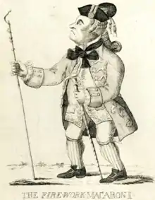 Robert Jones was a lieutenant in the Royal Artillery, but was called "Captain Jones" by the popular press and royal court during the late 1700s.[6][7] He was most likely a part of the Macaronis, who were seen in the press and by politicians such as the radical Whig John Wilkes as immoral and "demonstrably foreign".[8] Historian and LGBTQ scholar Rictor Norton, who called Jones "a popular character",[6] reported that Jones would attend masquerades dressed like the puppet character Mr Punch.[6] In 1765, Jones popularised fireworks by writing A New Treatise on Artificial Fireworks, which was frequently reprinted.[9] An illustration, which was published in October 1772, was probably a "caricature of Jones as the popularizer of fireworks".[9]