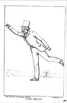 In 1772, Jones wrote and self-published The Art of Skating, the earliest book about figure skating. The book, which went through several reprintings and revisions and remained available until the mid-1800s,[6][10][11] was called by figure-skating historian James R. Hines "a milestone in the history of figure skating".[3] Jones described basic techniques of skating, which was a recreational activity at the time, before the development of figure skating as a sport in the late 1800s. He also described seven advanced figures, or "circular patterns which skaters trace on the ice"[12] that gave the sport of figure skating its name, with sketches and large colour plates of three of them, that were skated at the time.[7][13] According to Hines, the colour plates demonstrate the conservative nature of skating at the time; the clothing the skaters in them wore were "elaborate and formal"[14] (coats with tails and top hats), and one of the figures Jones describes, the flying Mercury, was inspired by mythology and "represented a nod to neoclassicism".[14]